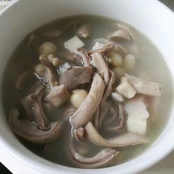 3.Put the yam, lotus seeds, gorgon seeds, poria and cut pork belly together Add to the previous soup and simmer for 1 hour.