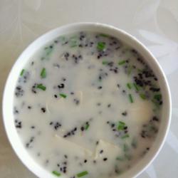 3.Add an appropriate amount of boiling water, stir with a spoon to thoroughly mix the fried flour and water., bring the soup to a boil over high heat, add the cut tofu slices, add appropriate salt and chicken essence, add the prepared pure milk into the soup, then turn to low heat and continue to simmer for 2 to 3 minutes, turn off the heat and sprinkle with chopped green onion.Add black sesame seeds and serve.