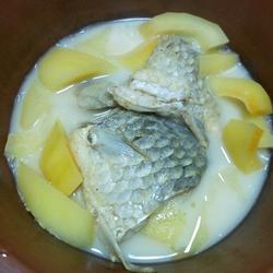 4.Peel the papaya, remove the white inside, cut it into the shape you like, put it in the stew pot with the fish, and add boiling water