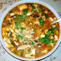 7. Heat the pan with cold oil, stir-fry the shredded ginger until fragrant, and add the marinated meat Pour in the shreds and stir-fry until half-cooked.Add shredded mustard and garlic chili sauce and stir-fry.Dish out and set aside.Rinse the pot, heat the pot with cold oil, add the tomatoes and stir-fry until they become mushy, add the mushrooms and fungus and continue to stir-fry for a while, then pour the shredded pork with minced garlic and pickled mustard into the pot, add cold water and cook until it boils Boil, mix the starch with cold water and pour it into the pot, stir a little, add lactone tofu, pour in balsamic vinegar, when the soup boils, pour in the beaten eggs, stir a little, wait until the soup boils again, add Tear the coriander into small pieces and sprinkle into the soup together with the chopped green onion.