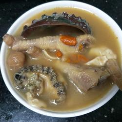 4. Put the chicken feet down, then put the fish maw, then the abalone, Add longan and wolfberry, and a few slices of ginger.Add appropriate amount of water.