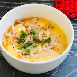 8.After the eggs are slightly solidified, add dried shrimps and steam for 5 minutes