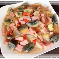 1. Prepare the baby cabbage, break it in the middle, and cut the ham and preserved eggs into cubes.