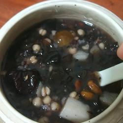 6. After the fungus and black beans are stewed in the pressure cooker, take them out, replace them with porridge over low heat, and add black rice, black sesame seeds, Pour coix kernels, black wolfberry, black dates, and yam into the pot and simmer for one hour.
