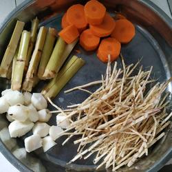 1.Wash the grass roots, peel and slice the bamboo cane, water chestnuts and carrots