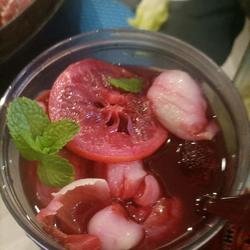 4. I simmered the bayberry for about 15 minutes, and the color came out.I added the peeled lychee meat and simmered it again.Make it for a minute or two, and let the lychees get a little red...