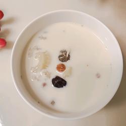 4.After the water boils, pour in the milk, remove the cores of the red dates, add the longan meat, peanuts, and rock sugar , stew in the pot for 1 hour, and add the wolfberry when it is out of the pot