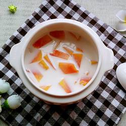 2.Put the papaya pieces into the stew pot, add rock sugar and appropriate amount of water.(Put the rock sugar at the bottom of the stew pot.It is easier to melt when put together with water.The amount of water is just enough to cover the rock sugar)