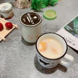 1. Prepare the ingredients: a bottle of Deluxe milk, a mango, a bag of gelatine powder, and a breakfast pot.2 pudding bottles