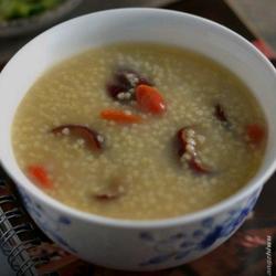 4.Put the cored and sliced red dates into the millet porridge and simmer over low heat for 30 minutes until the rice porridge becomes thick.