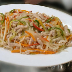 1. Cut the pork into medium shreds, add salt, sugar, MSG, starch water and sesame oil, mix well with chopsticks , add raw oil to cover the shredded meat and marinate.