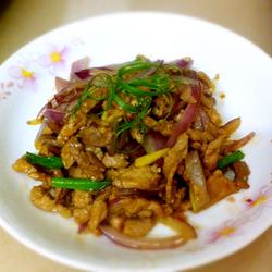 5.As shown in the picture: after stir-frying the pork for two minutes, add the onions and continue to stir-fry for another minute
