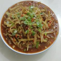 2. Stir-fry shredded pork, add chili sauce (one tablespoon), stir-fry, add shredded potatoes and carrots, stir-fry for a while and add appropriate amount of water