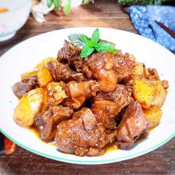 16.After about half an hour, the duck meat is cooked, add potatoes and pepper, mix well, and continue to cook for 5 minutes