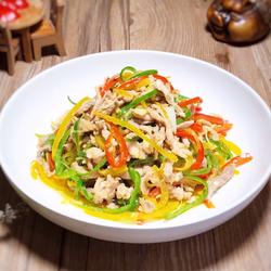 Colored peppers have thick flesh, so when cutting them into shreds, you can split them into two pieces in the middle, so that the shreds will be thinner and evener.