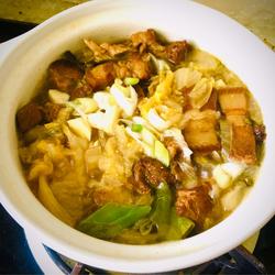 2.Put in the pork belly cooked in advance and add an appropriate amount of boiling water.
