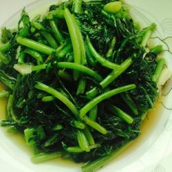 5.Add in salted chicken essence and stir-fry until the chrysanthemum becomes soft
