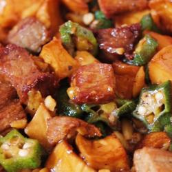 5.Lastly, add king oyster mushrooms, beef, okra, and black pepper sauce to the pot, add a little light soy sauce and a little water, stir well and serve!