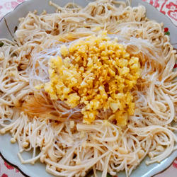 5.Use a container to spread the enoki mushrooms to the bottom of the container, and spread the vermicelli on the enoki mushrooms.Place the fried minced garlic on top of the vermicelli and pour steamed fish soy sauce over it.