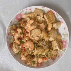 6. Add oil, add green onion, white ginger and garlic and sauté until fragrant, add minced meat and stir-fry until cooked, add appropriate amount of light soy sauce to taste.Stir-fry twice, pour in the soup cooked with shrimp heads and cook until it boils, add the fried tofu, sprinkle with millet pepper, cover the pot and simmer until half of the soup is reduced