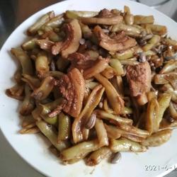 10. Put the pork belly and kidney beans into a sauteed wok and stir-fry, about In about 5 minutes, you should see the kidney beans soften and turn light green.