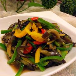 7.Add the eggplant strips and stir-fry over medium heat until the eggplant becomes soft and transparent