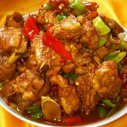 10. When the chicken pieces are eight times cooked, add salt, add green and red peppers and stir-fry until cooked, add a little MSG and stir-fry evenly