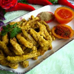 8. After the oil is hot, add the tenderloin strips and fry over medium heat until golden brown.Remove the oil control.