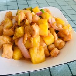 5. Add diced chicken, pineapple, green pepper and onion, stir-fry for a while.