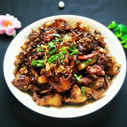13.Pour in the dried bamboo shoots and prunes, stir-fry evenly, and transfer to a plate