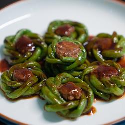 6. Weave the long beans into a wreath, put an appropriate amount of meat stuffing on the wreath and compact it