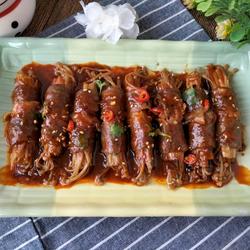 3.Use a fat cow to roll up the enoki mushrooms one by one