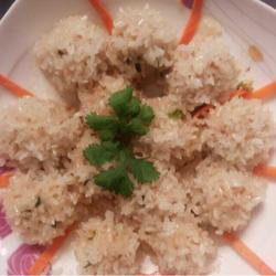 4. Control the water and wrap the meatballs evenly with glutinous rice as shown in the picture.