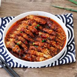 4.Take a piece of fat beef, add enoki mushrooms, and slowly roll it up