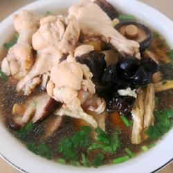 7.Put chicken wing roots, mushrooms, fungus, yuba, onion, ginger, garlic, and wolfberry into the pressure cooker, add cooking wine, soy sauce, a spoonful Salt, appropriate amount of oil
