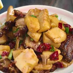 6.Add bamboo shoots to the pot, stir-fry the bamboo shoots until they are charred, add light soy sauce and cooked bacon , scallions and dried chili peppers