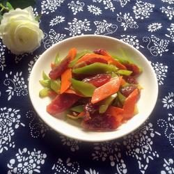 5. Add the sausage slices and stir-fry.Add a little cooking wine and stir-fry to remove the smell.