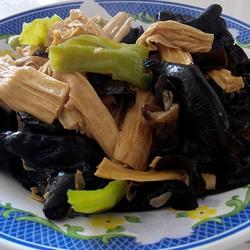 4.Put a pot on the fire, add oil, heat the oil, add yuba, fungus, and green pepper and stir-fry