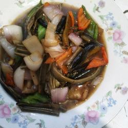 3. Heat oil in a pan, stir-fry onions and green and red peppers until they are seven ripe, add shredded eel