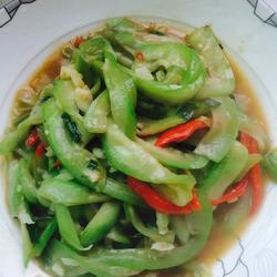 2.Peel the loofah and slice the red pepper into shreds