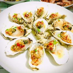 5. Put a small spoonful of garlic chili sauce on each oyster.Light some oil.