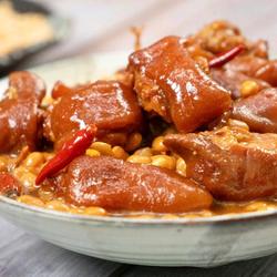 11.Because the sugar color is fried The color of the pig's trotters is obvious, the bright red color complements the golden color of the soybeans, and the soup mixed with rice is super delicious, ensuring that you will have two bowls of rice in no time.