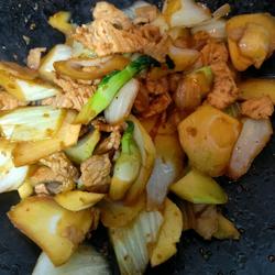 3. Heat the cold oil in the pan, add minced ginger, pork belly, and pepper noodles in sequence, and stir-fry until When the meat turns white, pour in an appropriate amount of light soy sauce, stir-fry until it becomes coloured, then add the fennel roots and stir-fry, add a little salt when it is about to come out of the pot