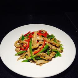 9.Then add green pepper and red pepper shreds and stir-fry for a while