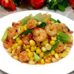 8.When the shrimps are cooked, add corn kernels and stir-fry evenly