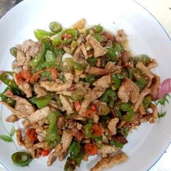 2. Add oil to high heat, stir-fry the shredded pork when the oil is hot, and take out