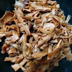 3.Add dried bamboo shoots and stir-fry for a while, then add boiling water to boil