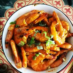 6. If you want to eat tender prawns, simmer them for less time, turn off the heat and cook them until they are tender.plate.If you want the prawns to look good, don't pour the shrimp juice into the plate yet.Add a spoonful of starch and stir over low heat.When the juice thickens, pour it into the shrimp plate.Finally sprinkle some green onions for garnish.