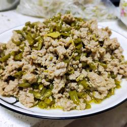 7.After the minced meat changes color, add the cowpeas and continue to stir-fry