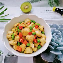 8. Stir-fry for a while, add diced chicken and stir-fry together, then add a spoonful of light soy sauce to enhance the freshness